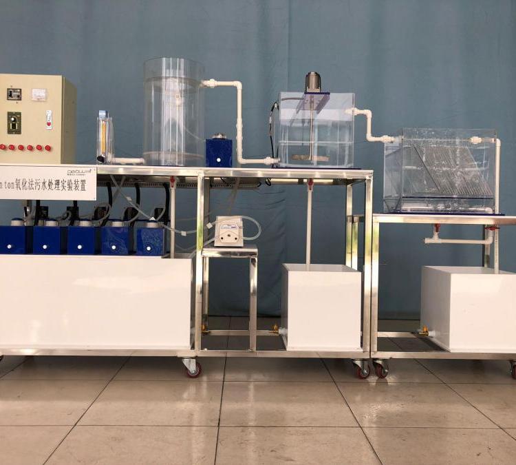 處理水量:50L~100L/h、裝置外形尺寸:1000×400×1500mm 、電源 220V 功率300W、裝置由透明有機玻璃制成Fenton反應器1套、配水箱1只、進水泵1臺、加藥蠕動泵4臺、電機攪拌器1套、液體流量計1只、電控箱1只、漏電保護開關(guān)、按鈕開關(guān)、連接管道和球閥、帶移動輪子不銹鋼臺架