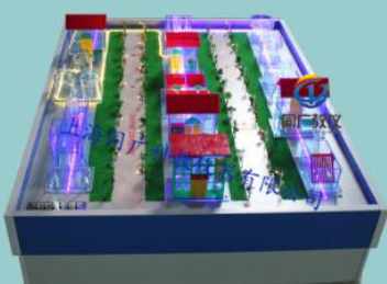 本模型主要由有機玻璃制成、模型的主要構筑物包括集水井1個、進水泵房與空壓機房1個、曝氣沉沙池1個、初沉池2個、推流曝氣池 1個、污泥回流泵房與污泥泵房1個、平流式沉淀池2個、出水泵房與電源控制室房1個、無閥濾池1個、污泥消化池2個、脫水機房 1個、沼氣貯存罐消化池2個、消毒池1個、按鈕開關1批、、路燈1批、綠地 1批、樹木1批、門房、燈光顯示進水管道、燈光顯示供氣管道、燈光顯示污泥回流管道、控制開關6個、道路及各種連接管道1批、帶移動輪子不銹鋼支架等組織成。