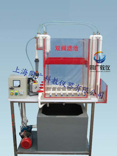 1、雙閥濾池1套:透明有機(jī)玻璃材質(zhì)、厚度10mm,包含濾池1格、排水虹吸管1套、進(jìn)水水虹吸管1組、布水槽1只、虹吸發(fā)生裝置1套、中央反沖洗槽1套、出水渠1只、反沖洗連接管1套;