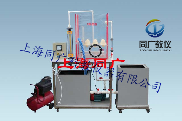 1、單格V形濾池1套:透明有機玻璃材質、厚度10mm,包含小阻力配水系統(tǒng)、配氣空濾板,氣吸管、水沖洗水管、濾料層、進水V型槽、排水槽、清水渠、排水渠等;